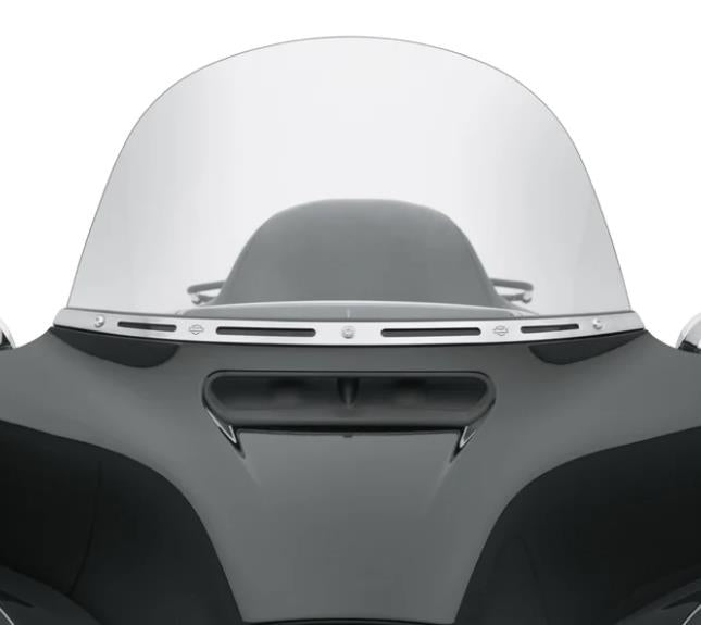This highly polished stainless steel windshield trim is accented by four slots that allow the color of the outer fairing to show through.