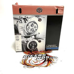 Headlamp features a single top-mount low-beam projector lens, a large bottom-mount high-beam projector lens and 2 "D" shaped fill-light lenses. The low-beam pattern remains illuminated at all times, and the switched high-beam adds illumination down the center line. The LED lamps are DOT approved for use in all 50 states.